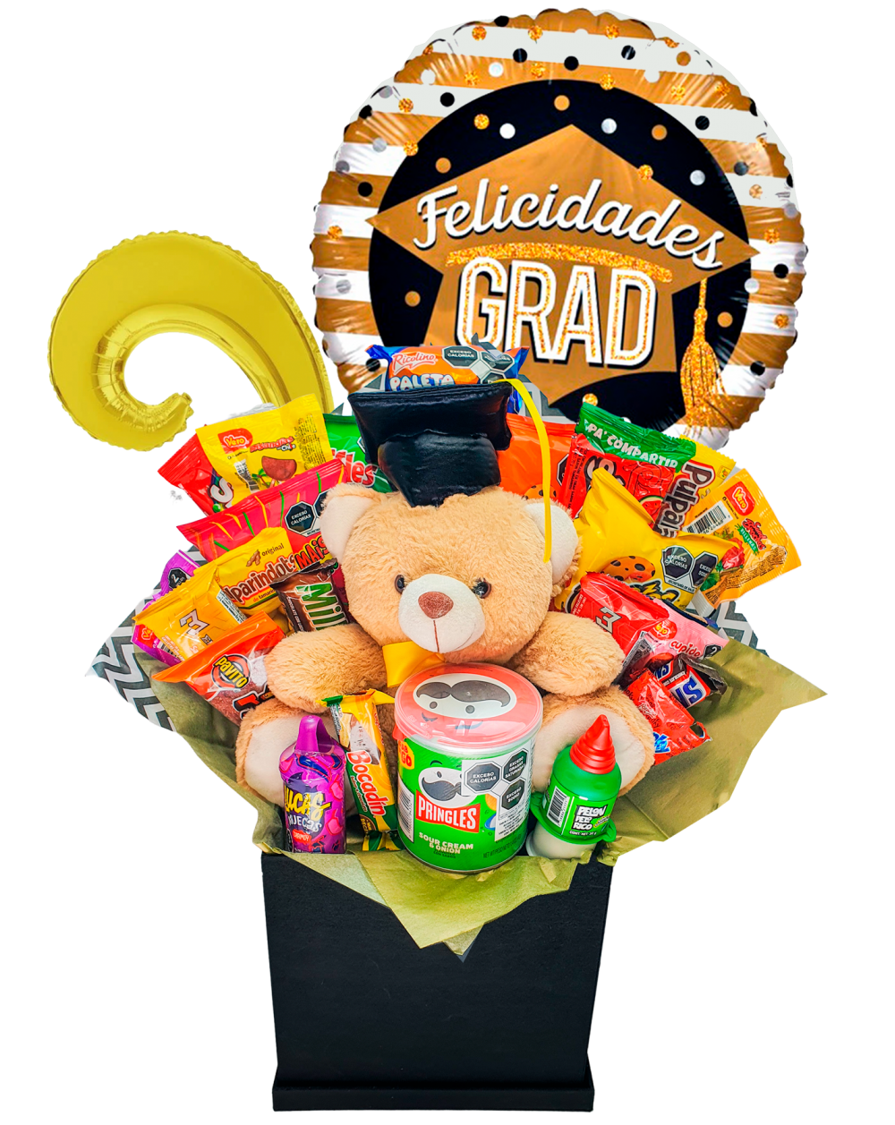 Surtido delicioso de dulces de las mejores marcas, incluye un globo grande con aire, dos globos de espiral, muchos dulces, y una cajita de madera de color.