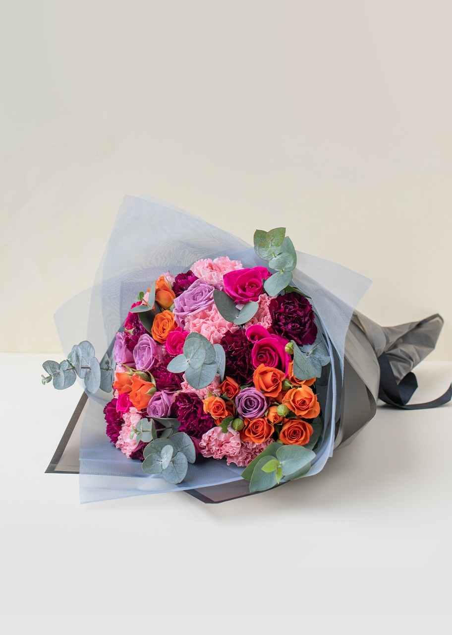 Regala este hermoso ramo con 6 rosas fiusha, 6 rosas lila, mini rosa naranja y claveles; este detalle es ideal para sorprender y demostrar tu cariño a esa persona especial. ¡Es perfecto para celebrar cualquier tipo de ocasión!