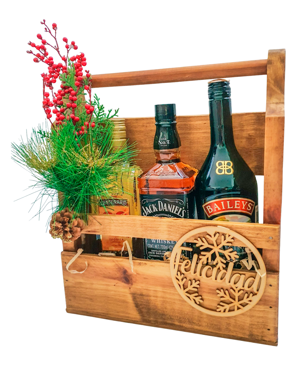 Exclusivo arcón a domicilio ideal para sorprender a tus seres queridos, o colaboradores VIP, incluye tres bebidas de reconocidas marcas, en un hermoso six de madera de pino, decorado .